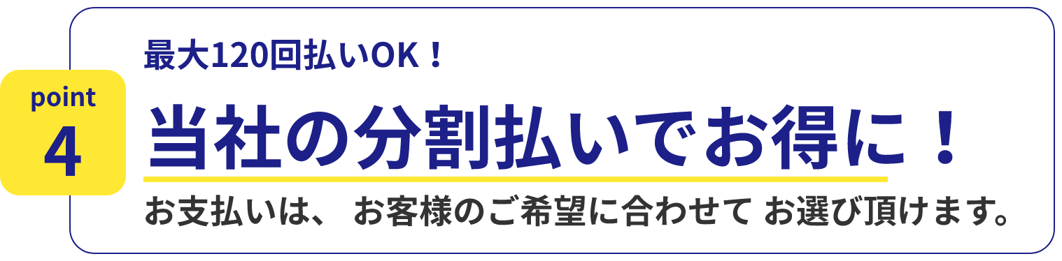当社の分割払いは「頭金0円 OK 」「ボーナス払い OK 」、そして分割回数は「最大120回まで OK 」とお客様のご要望に合わせたご提案が可能です。