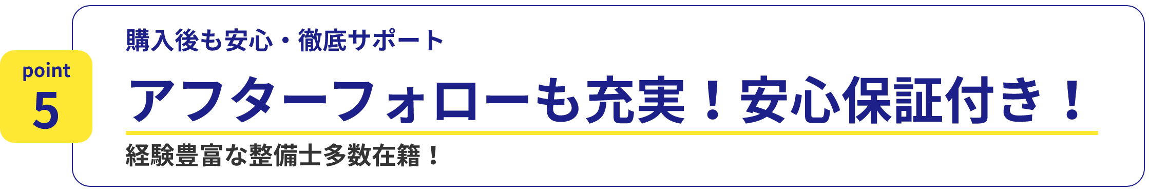 車検はもちろん、オイル交換やタイヤ交換、各種点検・修理・板金なども対応可能。お車のことなら全てお任せください。お車の販売だけではなく、購入後もお客様に選ばれ続ける店舗を目指していきます。そして、当店でご購入いただいたお客様は安心の保証付きです。お車に不具合が生じた場合には、お気軽にお申し付けください。